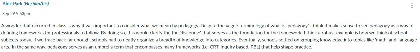 In week 1, my reflection did not reveal any hidden assumptions and mostly presented a modified understanding of what constitutes ‘pedagogy.’ While I abstractly identified a layer of a ‘goal’ when hypothesizing about the ‘ideal pedagogy’ for each subject, my critical reflection missed the mark in addressing assumptions about myself or the school environment.
