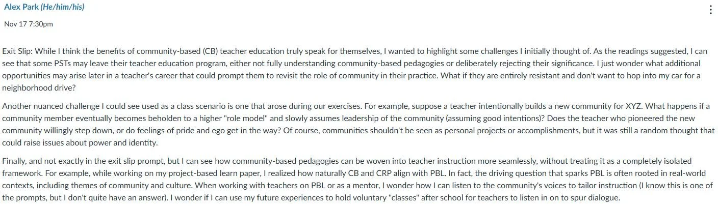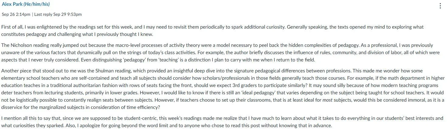 Pedagogies of Professional Education End-of-Quarter Reflection