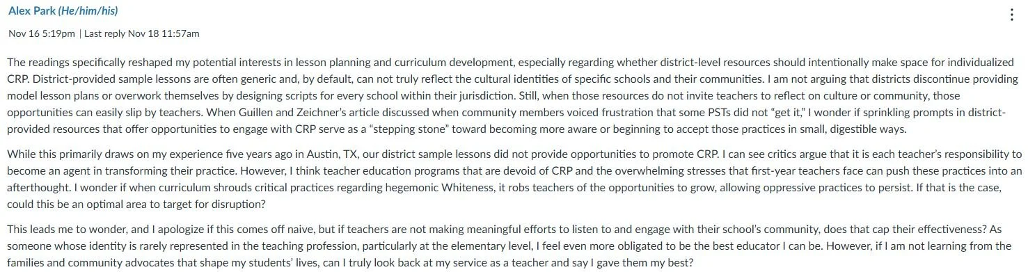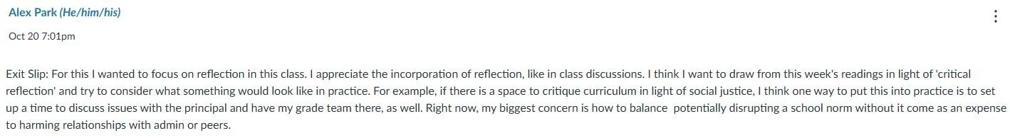 Lastly, with the week 8 reflection, there was a substantial effort to integrate the content from our readings with social justice-aligned goals and to question my assumptions. I noted a teacher’s ‘obligation’ to strive to become the best teacher they can possibly be, and how to create space in district-level resources for teachers to reflect on culturally responsive pedagogies, hopefully with critical consciousness.